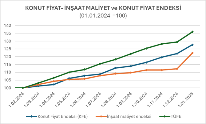 Verileri yorumlayan Denge Değerleme Genel Müdür Yardımcısı Ahmet Arslan, “Bugün TÜİK tarafından açıklanan İnşaat Maliyet Endeksi, yılın ilk ayında işçilik maliyetindeki artış sebebiyle yüksek artış gösterdi. Ancak son bir yıllık verilere bakıldığında hem enflasyonun hem de konut fiyatlarının altında seyir izlediği görülmektedir.” dedi.