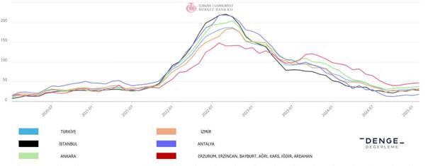 “Ankara’yı, yıllık artış oranlarında yüzde 32,7 ile İzmir ve yüzde 28,4 ile İstanbul takip ediyor. 2024 yılı boyunca yüksek seyreden endeks değerleriyle Ankara, iki ille farkını açmayı sürdürdü. İstanbul’da ise konut fiyatları, bir önceki yılın aynı ayına kıyasla yaklaşık yüzde 3’lük reel kayıp yaşadı. Aylık değişimler incelendiğinde, son iki ayda İzmir’de bir sıçrama gerçekleştiği, konut yatırımlarının enflasyon karşısında değerini koruduğu görülüyor. Şubatta konut fiyat endeksi İstanbul’da yüzde 2,6, Ankara’da yüzde 3,3 ve İzmir’de yüzde 3,8 değişim kaydetti.”