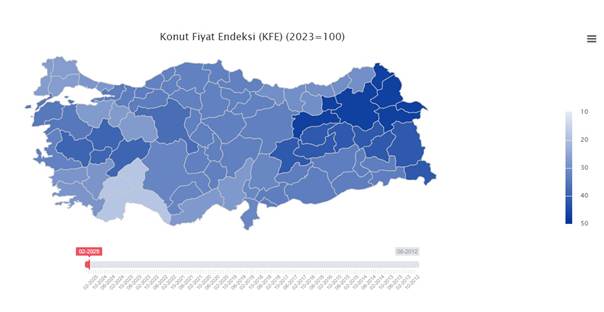 “Ülke genelinde en yüksek değişimi gösteren iller sıralamasında ise Doğu Anadolu illerimiz ilk sıralarda yer almaya devam ediyor. Bu durum; diğer illerde yüksek artışların olduğu dönemde bölgede artışın sınırlı kalmış olması ve yaşanan deprem felaketi sonrası bölgeye talebin artmasıyla açıklanabilir. Öte yandan son üç aydır ortalamanın üzerinde değişim kaydeden Doğu Ege illerimizden Afyonkarahisar, Kütahya, Manisa ve Uşak’ta önceki yılın aynı ayına göre yıllık değişim oranı yüzde 39,1 oldu. Bu bölgedeki konut fiyatlarının Batı Ege ve çevre illerine göre nispeten alım gücüne daha uygun olması, özellikle bu bölgede il dışından da yatırım amaçlı konut alımlarına neden oluyor.”